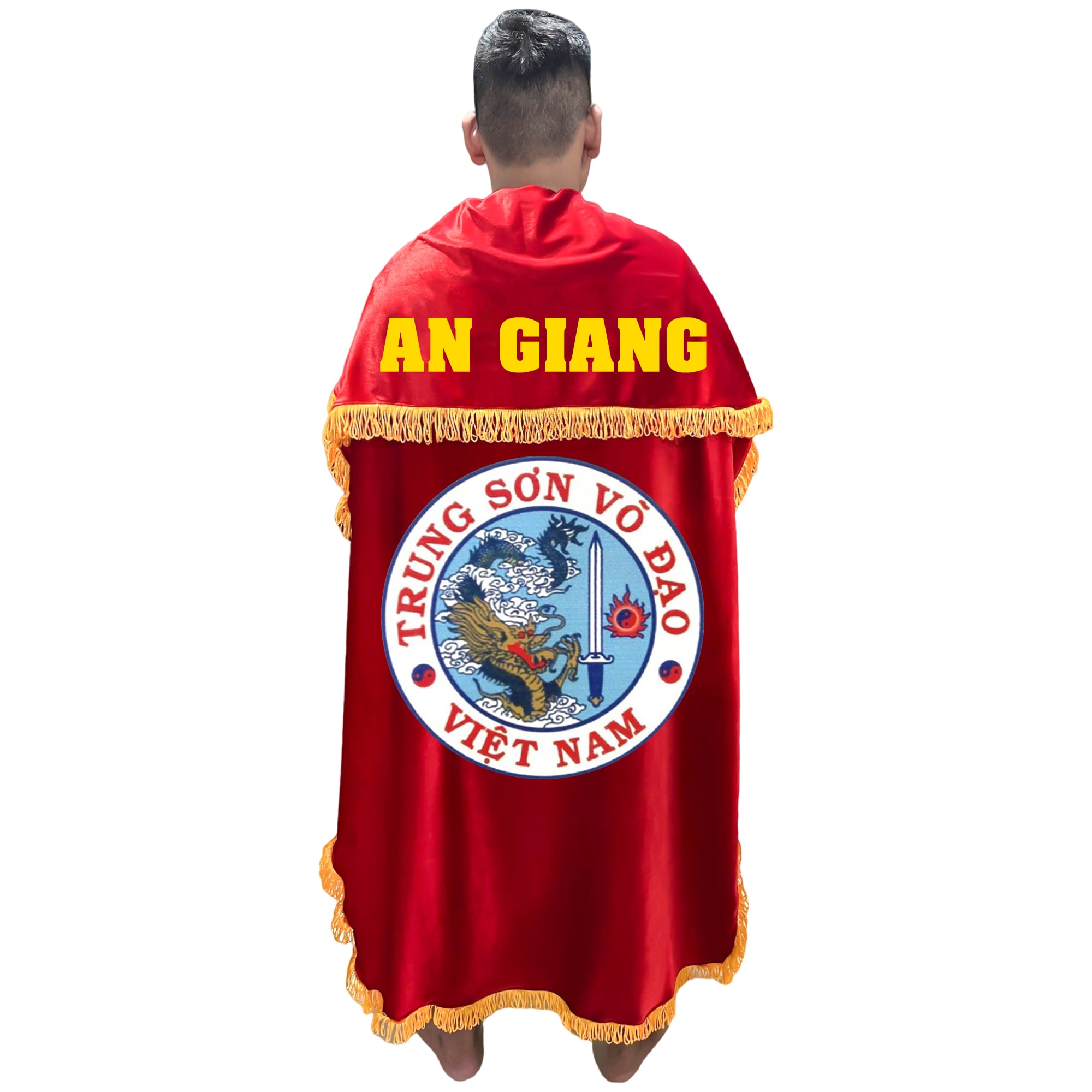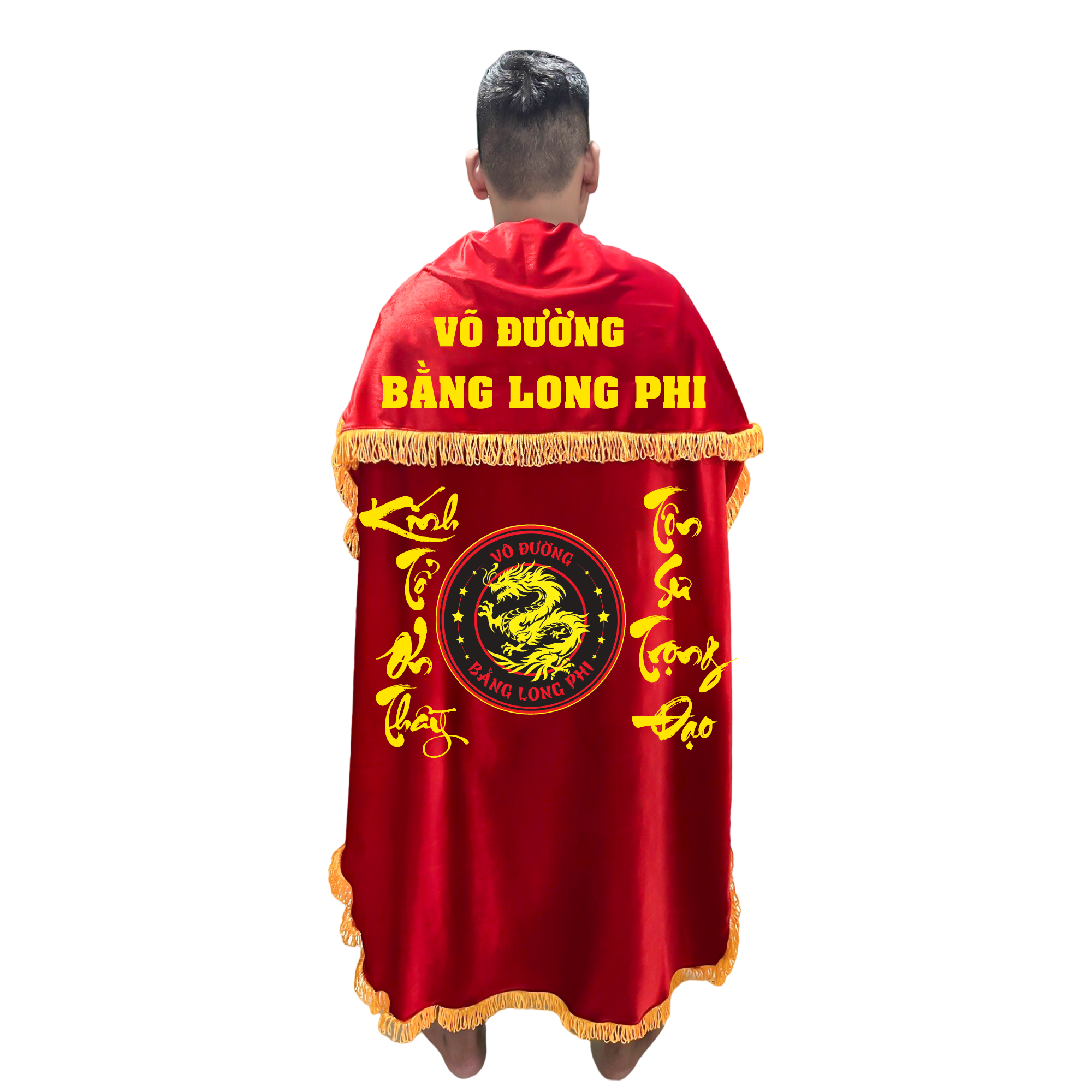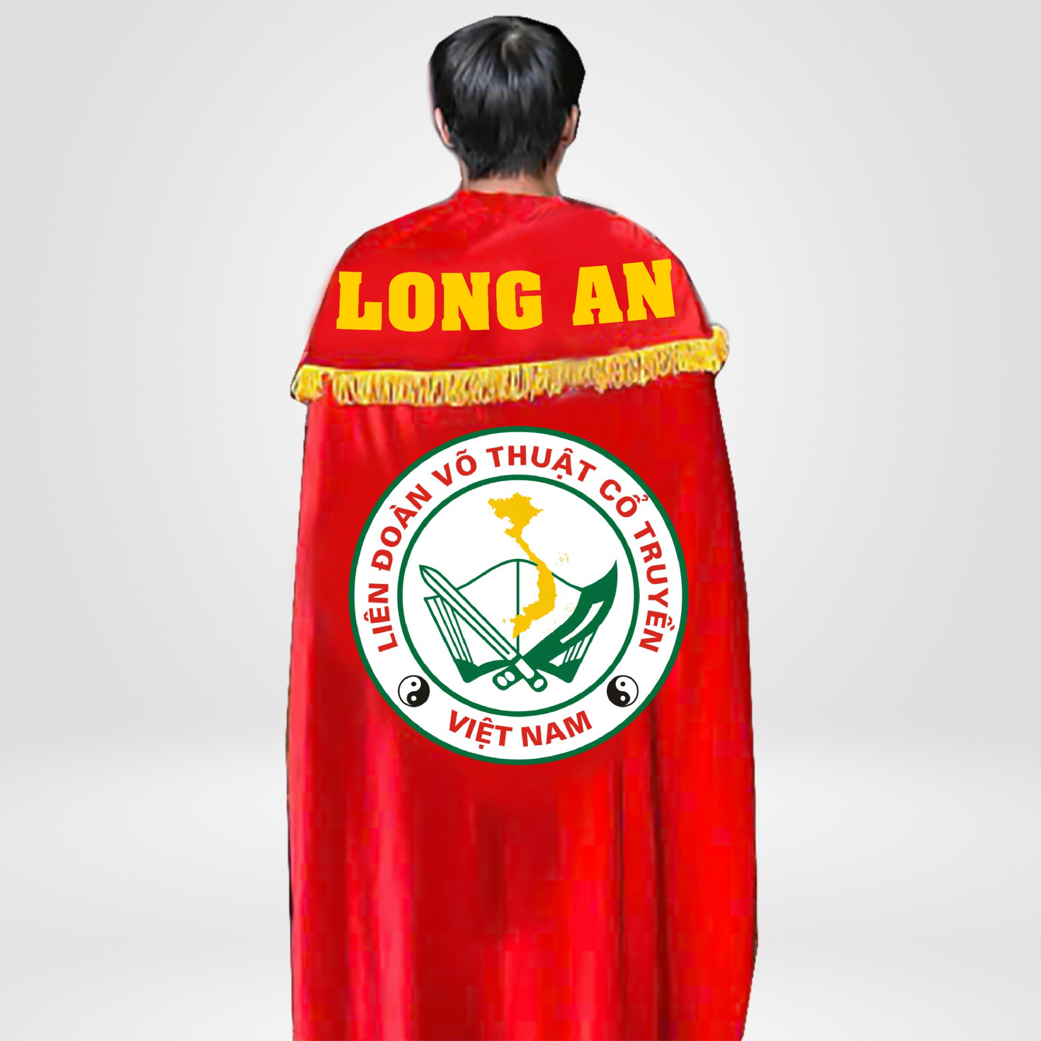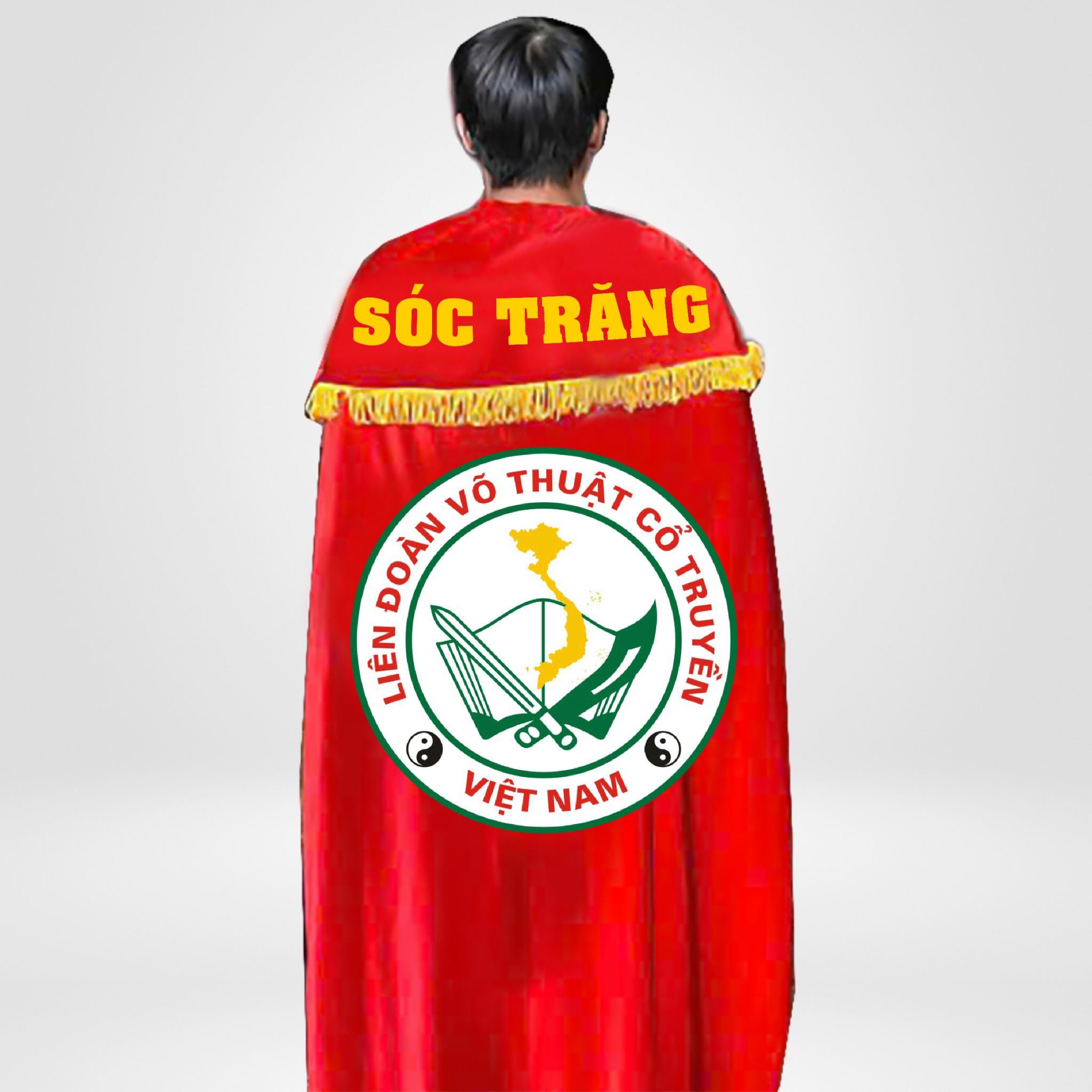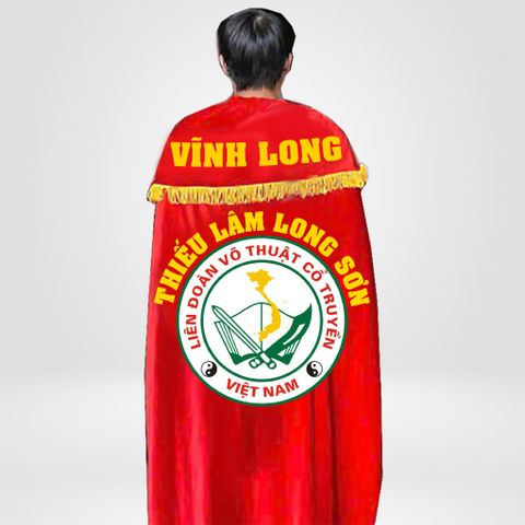 Áo choàng Võ Cổ Truyền được Siêu Thị Võ Thuật Việt Nam may từ vải nhung cao cấp với các đường tua vàng bao quanh áo.