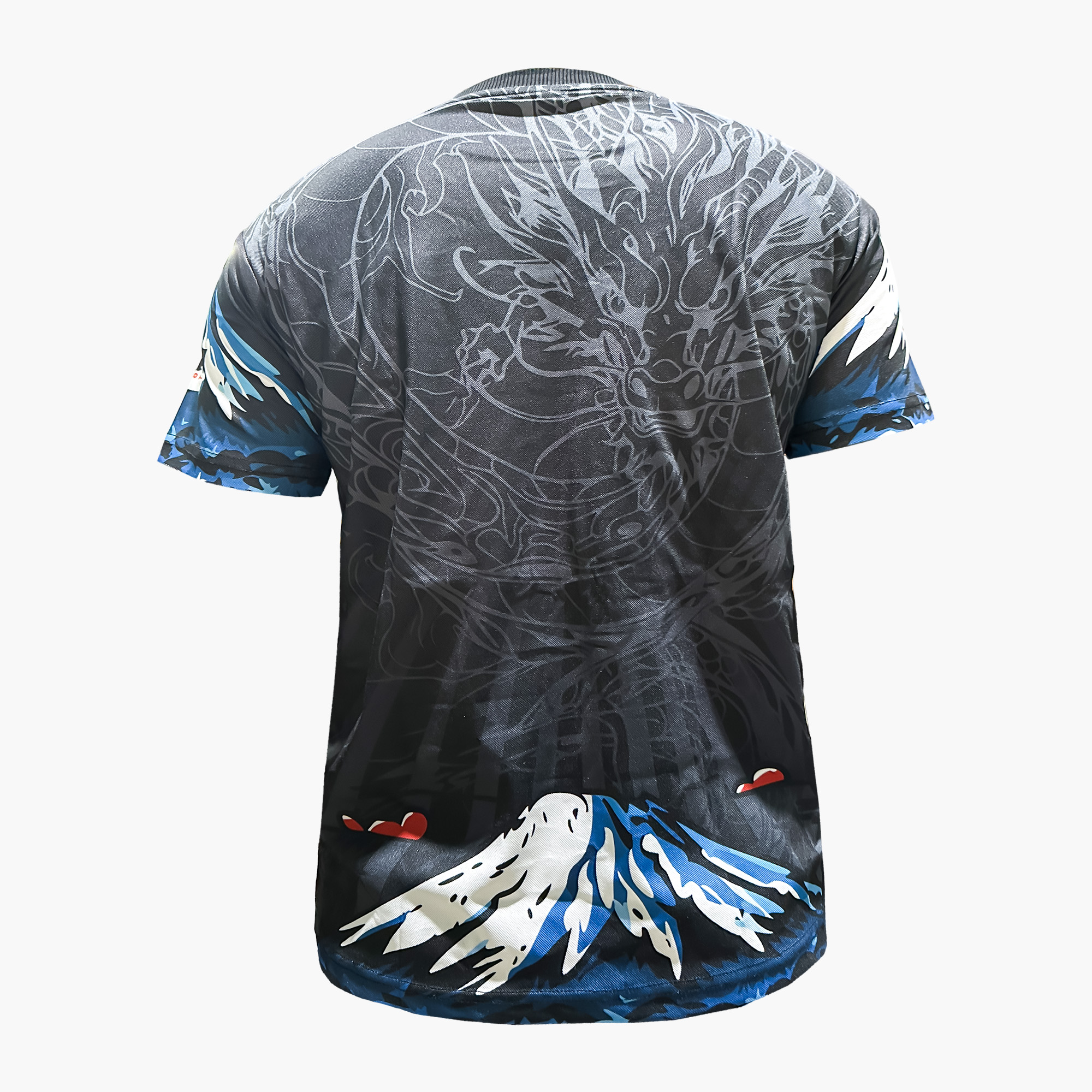 Nền áo được phối họa tiết núi Phú Sĩ phía dưới cùng các đường vân khói và hoa văn truyền thống Nhật Bản ở thân áo và vai, tạo chiều sâu và cảm giác bí ẩn.