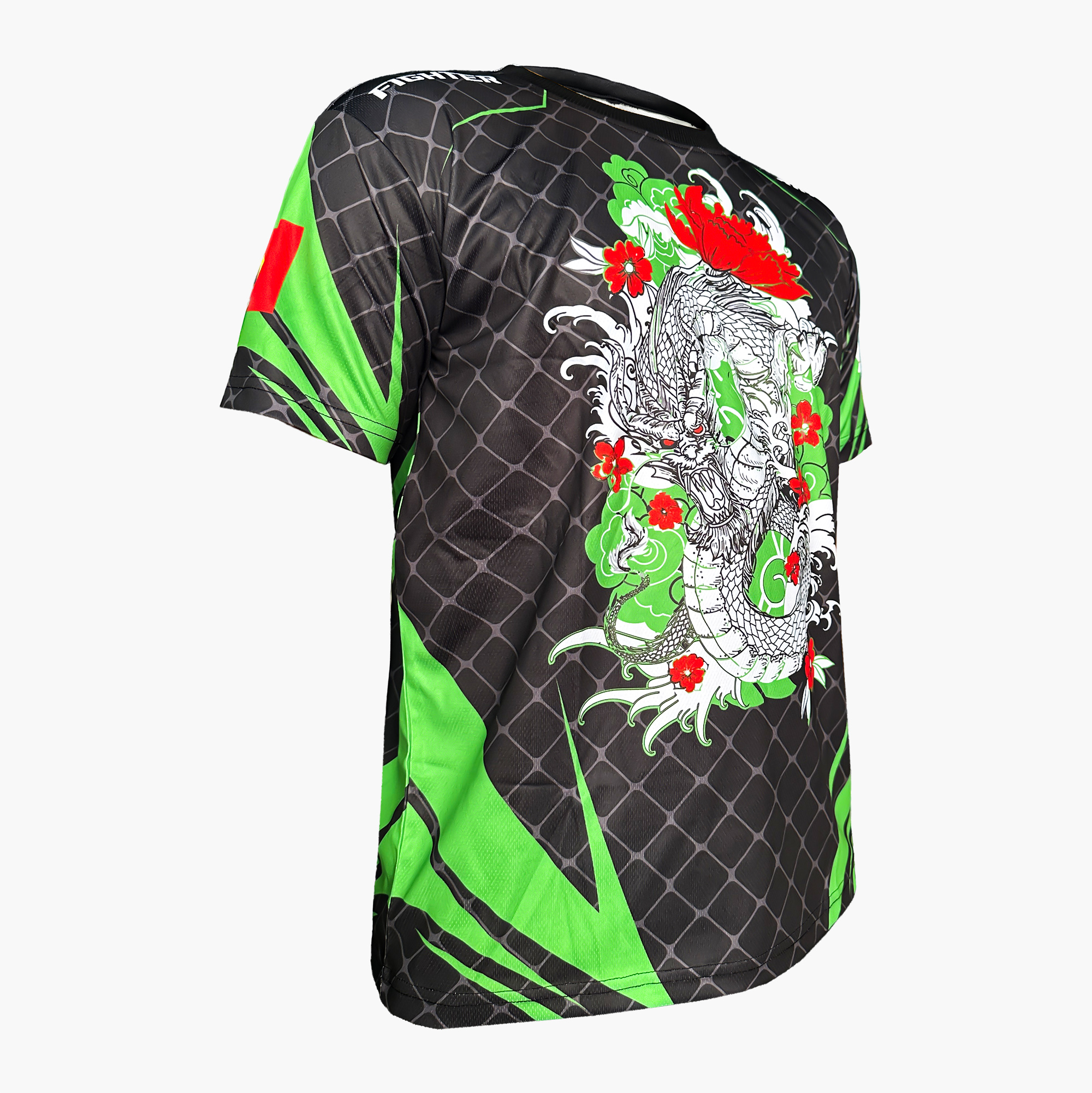 Họa tiết chính: rồng uốn lượn cùng hoa đỏ nổi bật, tượng trưng cho sức mạnh và tinh thần chiến đấu.