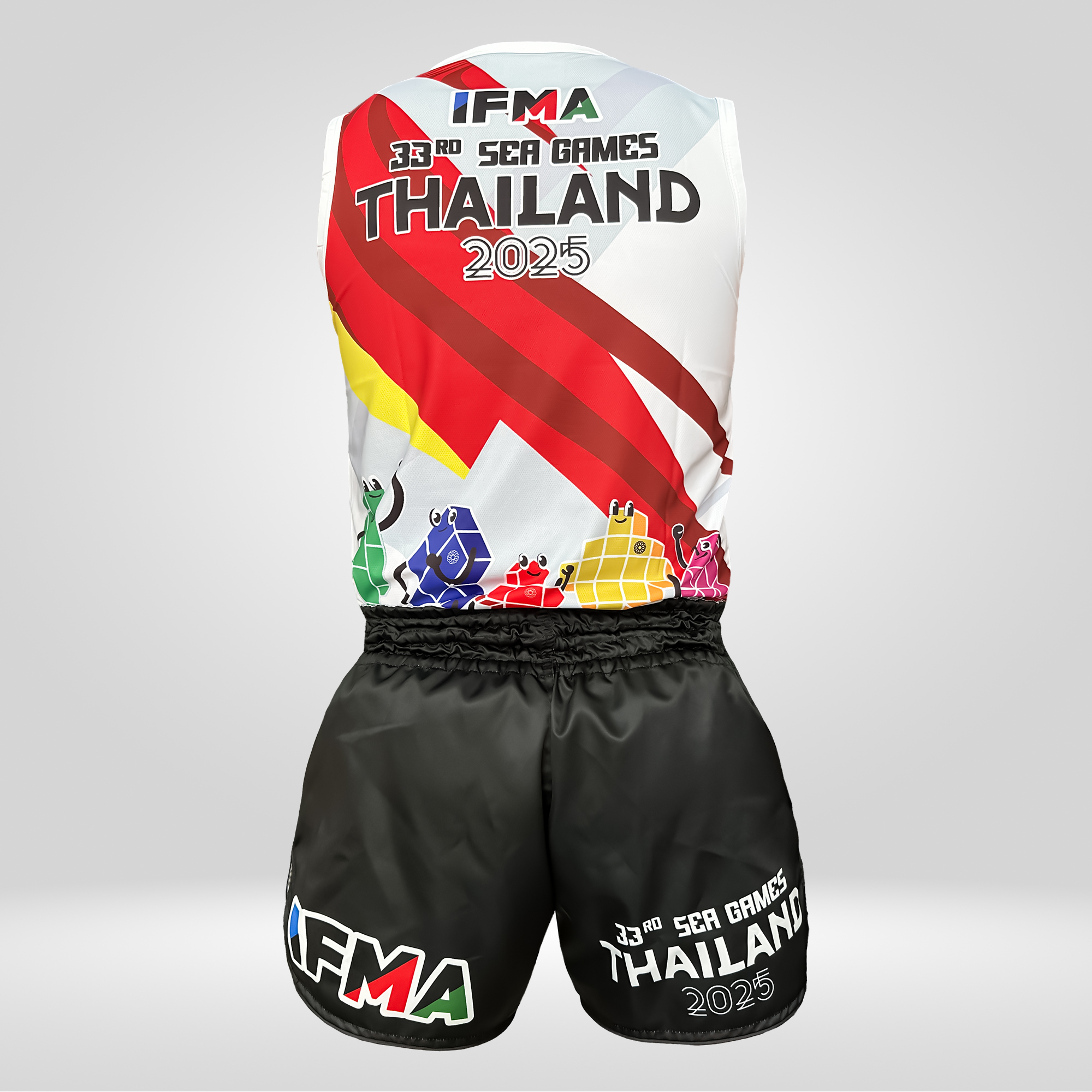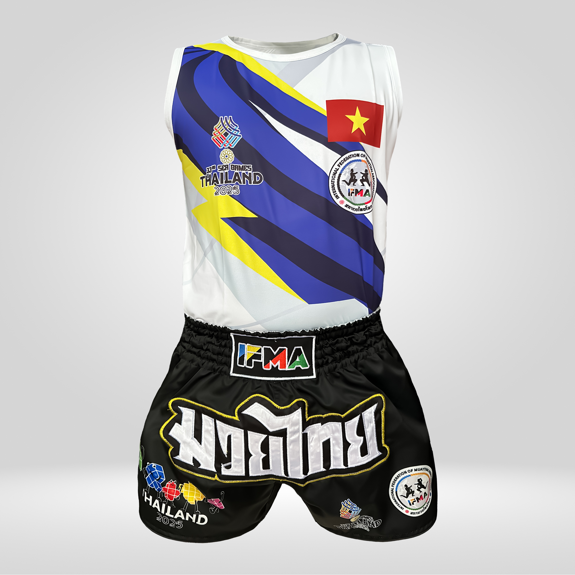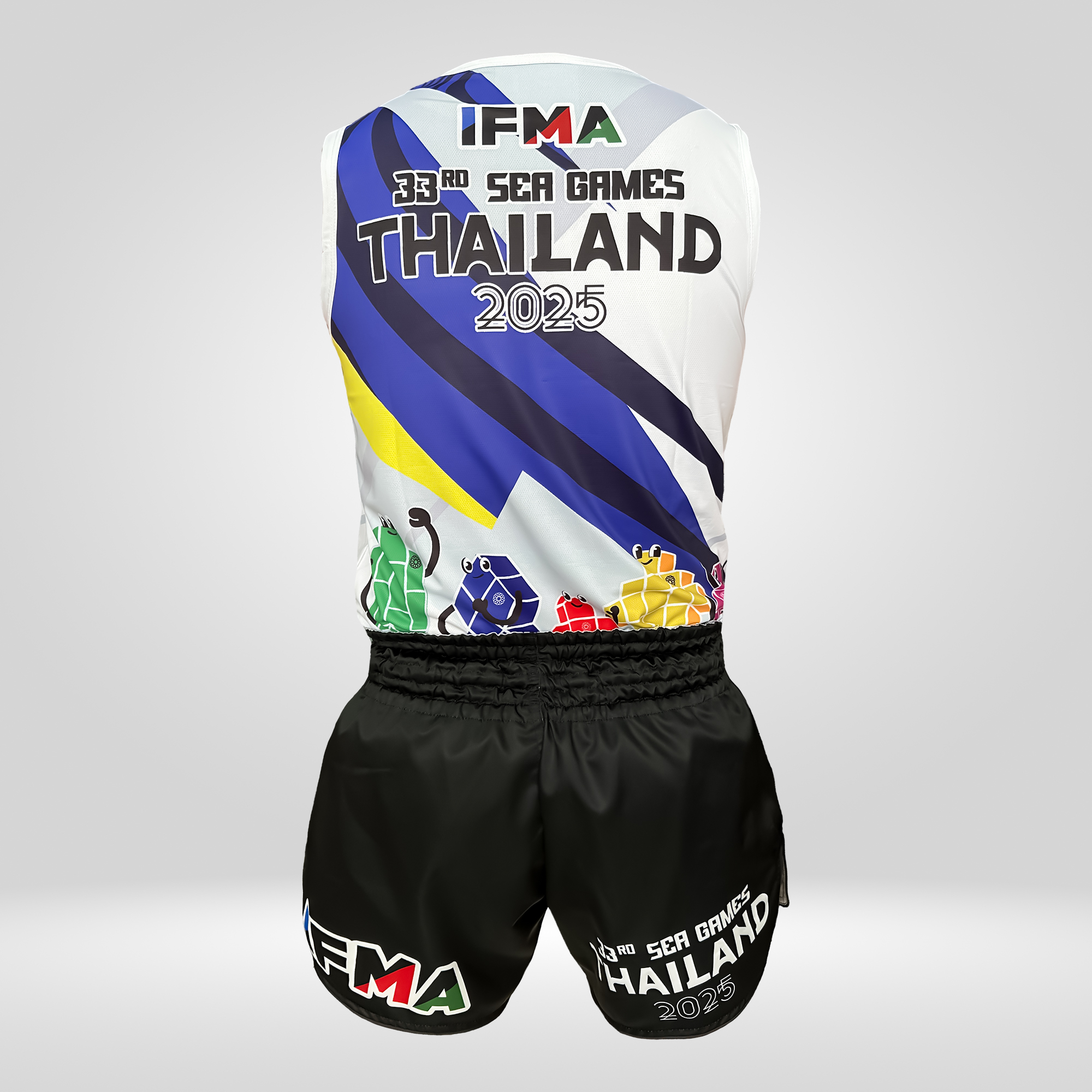 Quần Áo Muay Fighter IFMA - SEA Games 33 Thái Lan 2025 bao gồm một áo thun và một chiếc Muay Thai, được thiết kế với các logo SEA Games 33 và họa tiết đặc trưng của IFMA - International Federation of Muaythai Associations (Liên đoàn Muay Thái Quốc tế).